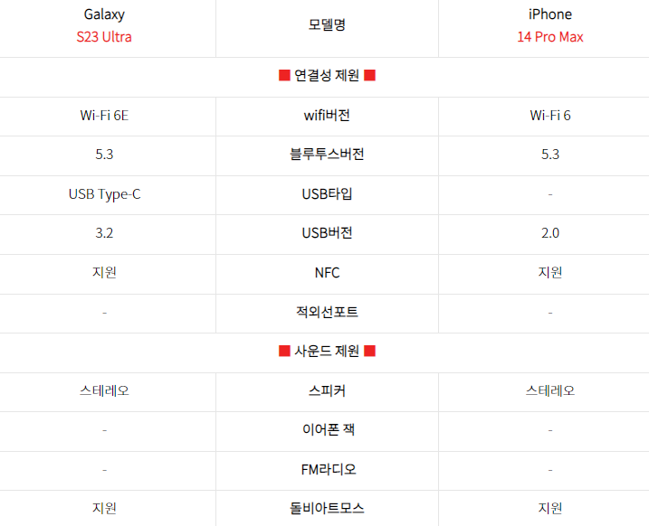 배터리 용량을 비교해 보면 갤럭시 S23 울트라는 5000mAh를 탑재하였고, 아이폰 14 Pro Max는 4323mAh를 탑재하여, 갤럭시가 좀 더 많은 용량을 가지고 있다.