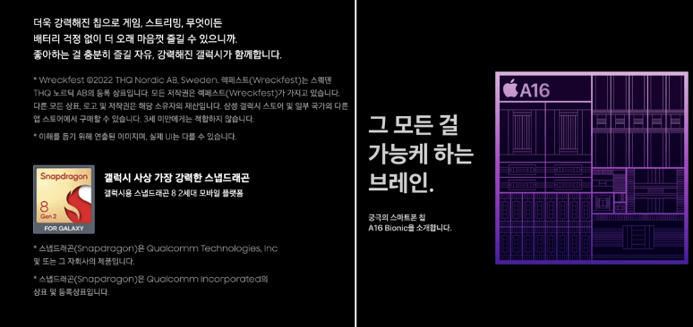 갤럭시에 들어가는 퀄컴 스냅드래곤8이나 엑시노스 최고사양 모델의 AP 성능 자체는 상당히 훌륭합니다.