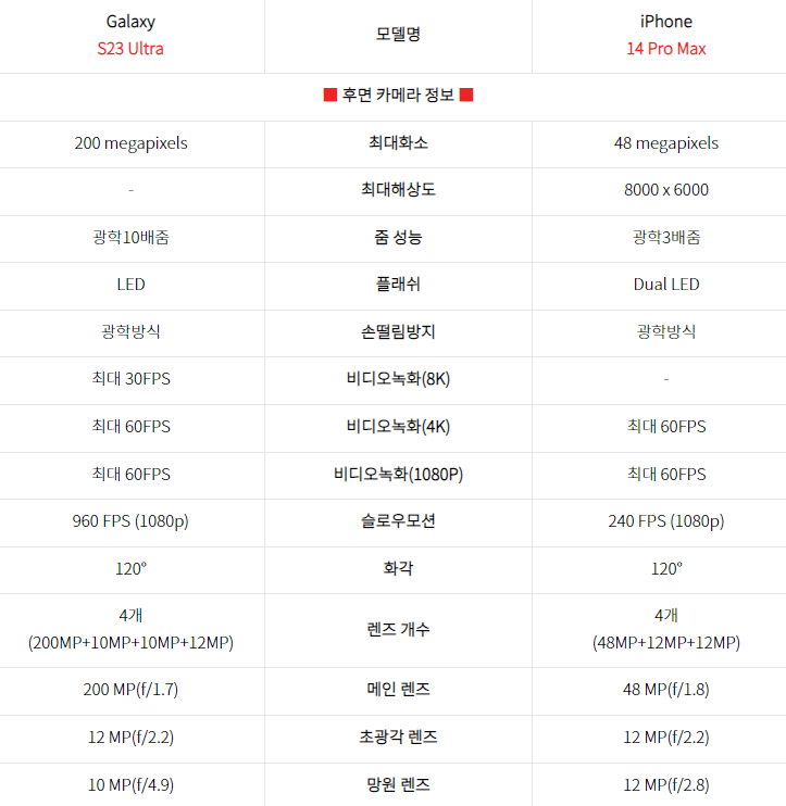 카메라를 스펙으로만 비교한다면 갤럭시 S23 울트라가 한 수 위입니다.