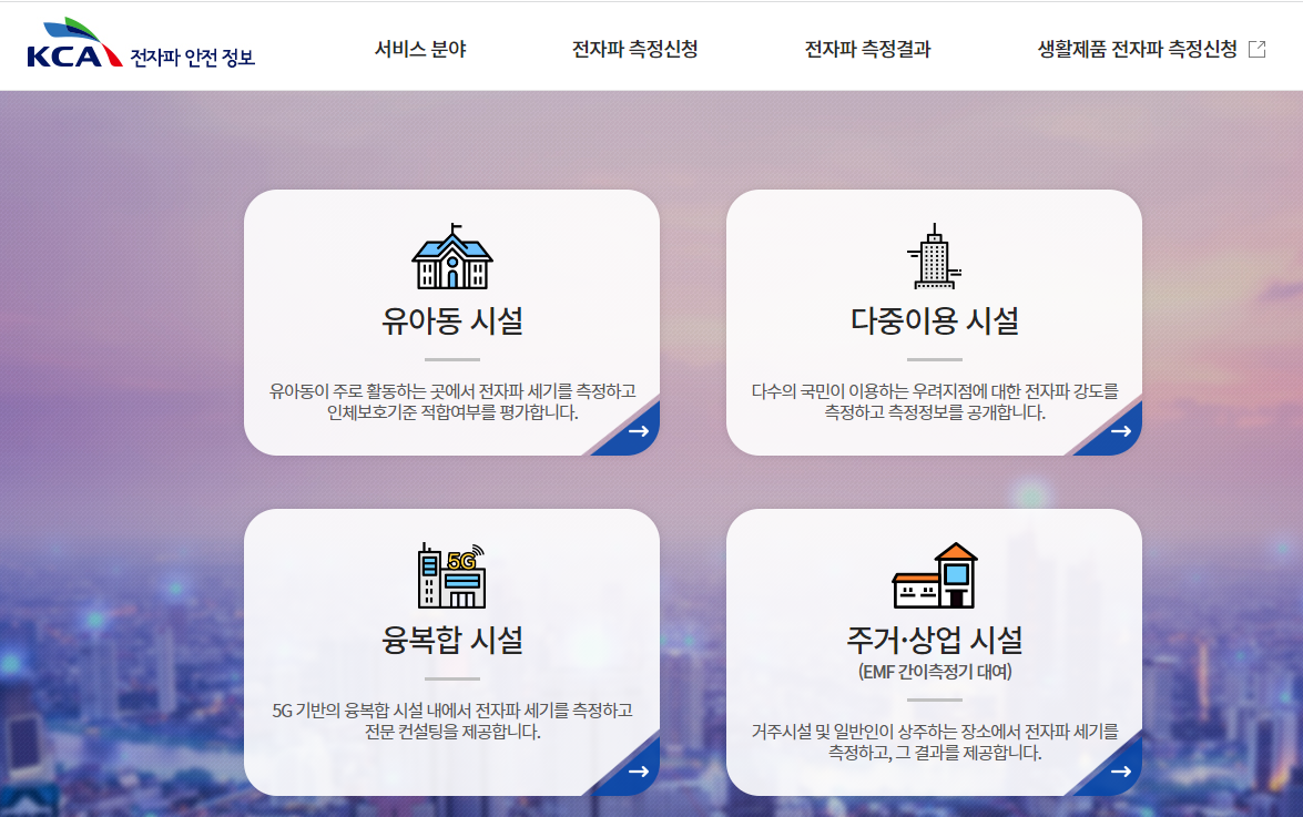 주거미 사무공간에서 생기는 전자파 세기를 국민 누구나 싣고 간편하게 책정 확인할 수 있도록 하는 서비스인데요 측정 결과는 전자파 관제 시스템을 통해 실시간 모니터링하고 측정 결과가 전자파 인체보호 기준을 초과하는 경우 정밀 측정 서비스를 제공합니다 신청은 전자파 안전정보 검색하셔서 홈페이지에 들어가시면 우측에 생활환경 전자파 측정 서비스 창이 있는데요 주거상업시설의 간이 측정기 대여 메뉴에서 신청하실 수 있습니다.