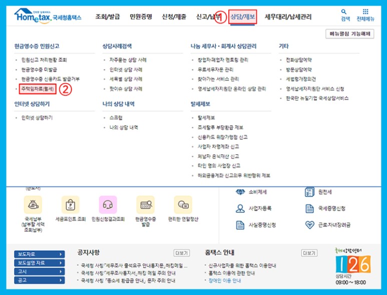 홈택스에 접속한 후 상담/제보 👉주택임차료(월세) 👉 주택임차료 월세액 세액공제 신청 순으로 클릭해 주면 됩니다.