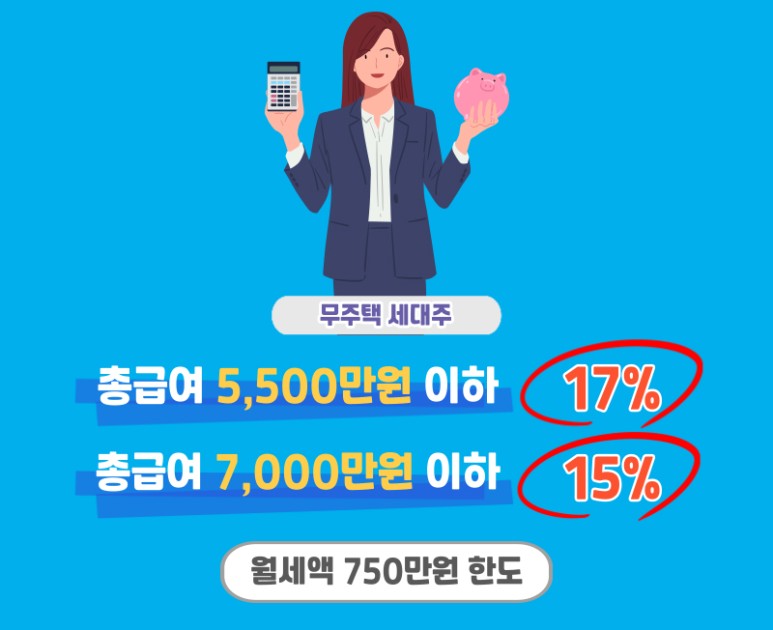 기준시가 4억 원인 집에 거주하더라도 혜택을 받을 수 있게 됐습니다. 월세 세액공제 조건은 기준시가 4억 원 이하 또는 국민주택 규모 전용면적 85㎡(25.7평형) 이하에 거주하고 있는 무주택 근로자의 연간 총 급여액이 7천만 원 이하이거나 종합소득 금액 6천만 원(자영업자) 이하입니다.