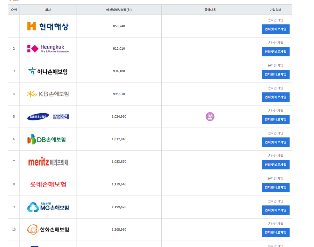 8️⃣ 최종결과 화면에서 저렴한 보험사를 선택해 인터넷 바로가입을 눌러서 가입을 진행합니다.