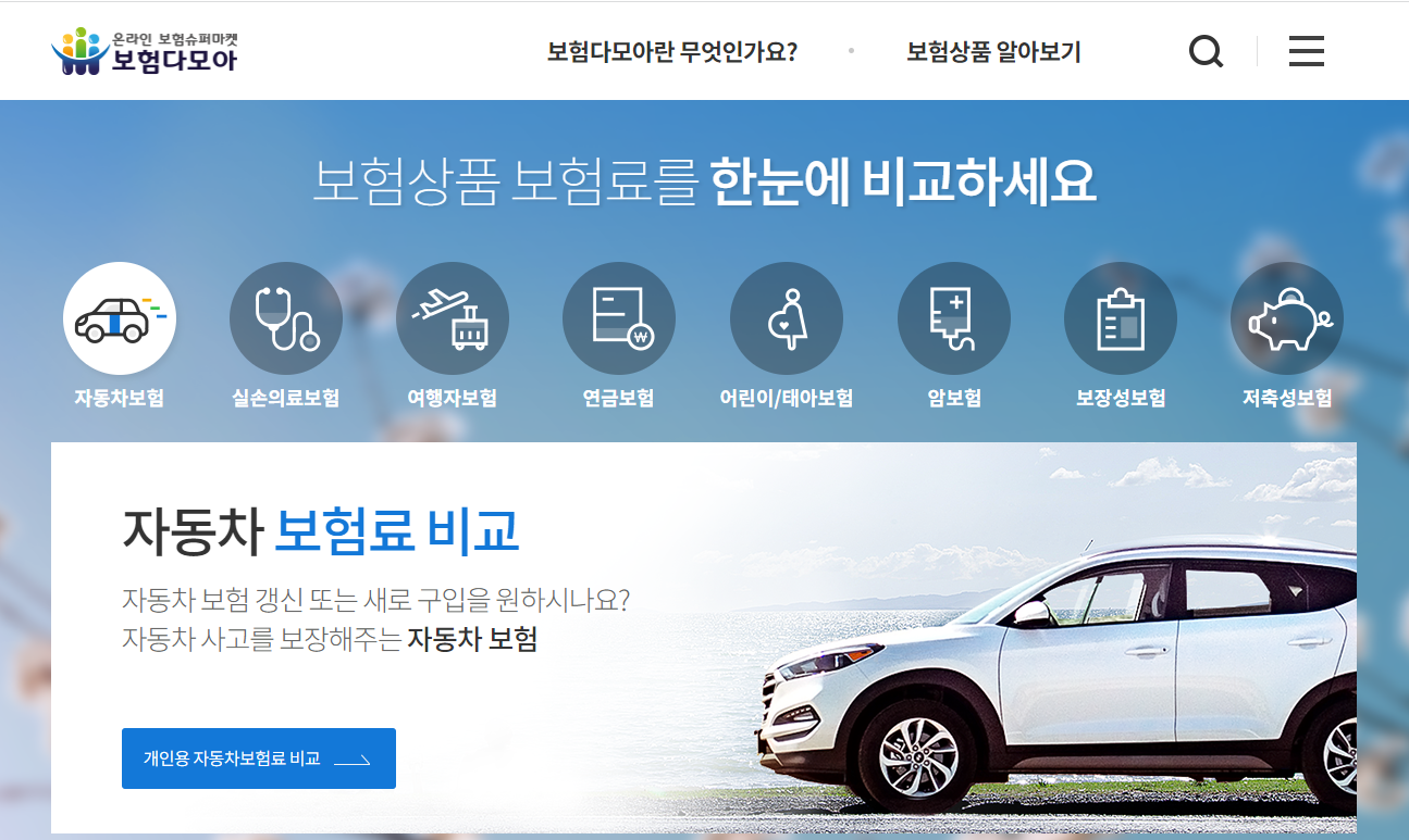 보험다모아 사이트는 실손의료보험, 자동차보험, 여행자 보험, 연금보험, 보장성보험, 저축성보험 6가지 보험에 대해서 대형 보험사의 보험가격을 비교해 주는 사이트입니다. 보험다모아 사이트에 있는 것은 다이렉트 보험입니다. 그러므로 인터넷 수준으로 설계사를 통하지 않고 보험을 저렴하게 가입할 수 있습니다.