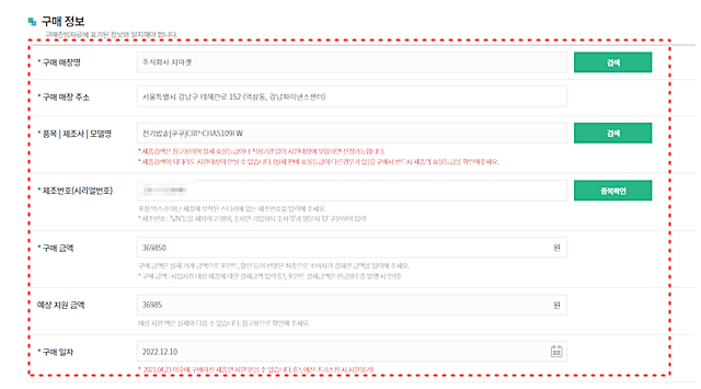 신청인 정보를 입력 후 구매정보 제품 정보 계좌 정보를 입력합니다.