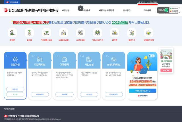 1. 먼저 한전 고효율 구매비용 지원사업 홈페이지에 접속하여 가입 후 로그인해야 합니다.